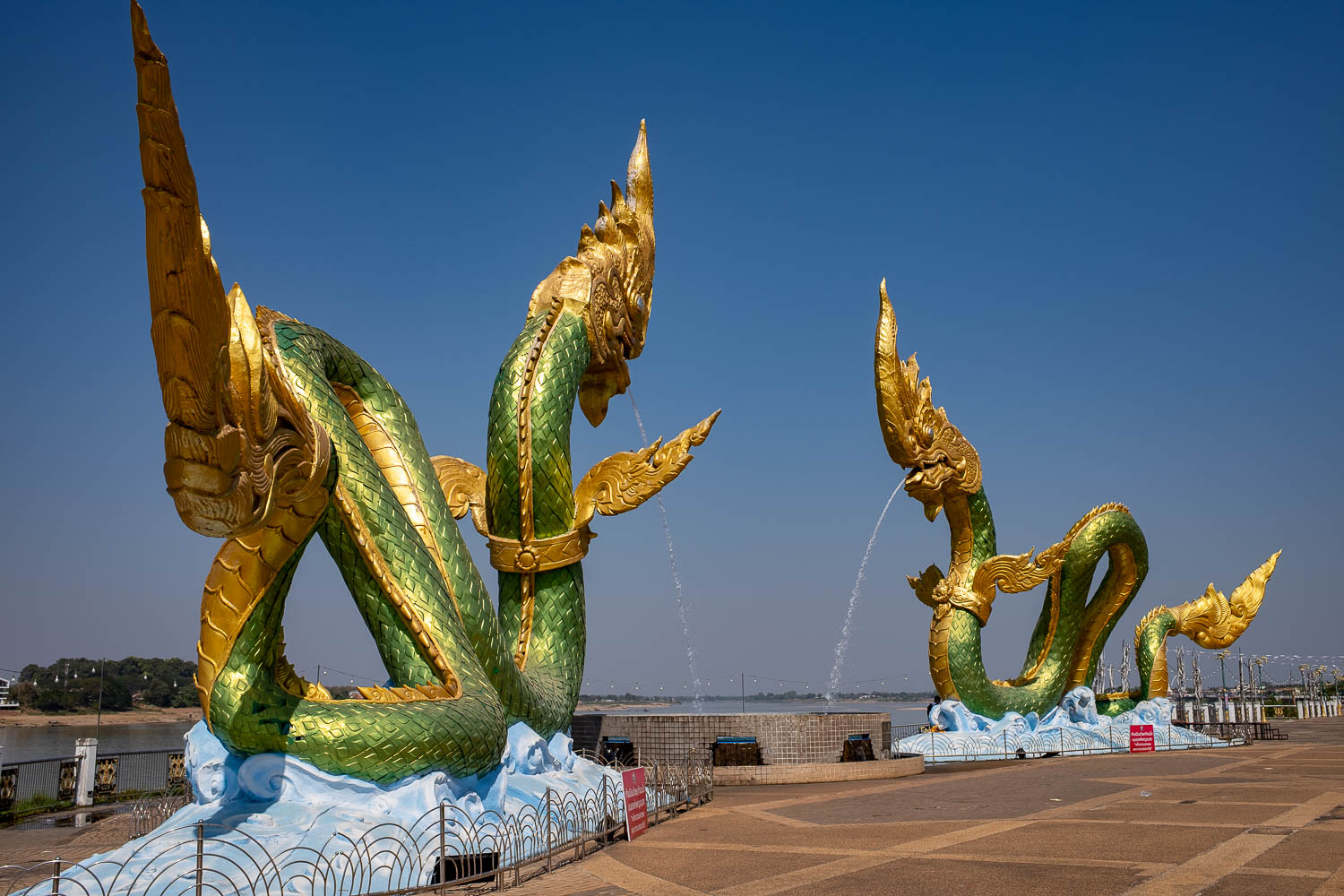 Per Shuttle geht’s über die Friendship Bridge 1, dann reisen wir wieder nach Thailand ein. Unser Gepäck geben wir am Bahnhof von Nong Khai ab und lassen uns zur Uferpromenade des Mekong zum Naga Denkmal fahren. Im Glauben der Thailänder und Laoten lebt auf dem Grund des Mekongs eine riesige Schlange, die als Gottheit verehrt wird. Ihr Zuhause ist hier – im quirligen Nong Khai. Daher sieht man auch überall in der Stadt Naga Skulpturen.
