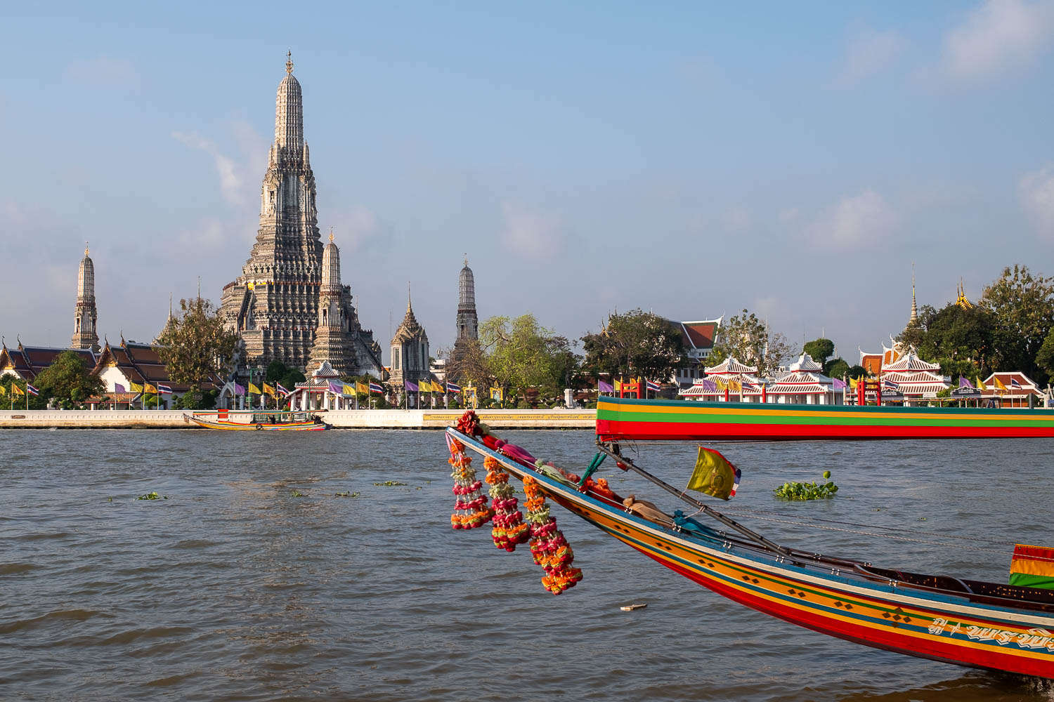 Wir sind so früh, dass wir uns entscheiden, direkt zum Wat Arun, dem Tempel der Morgenröte, zu laufen. Per Fähre gehts über den Chao Praya und wir sind unter den ersten Besuchern.