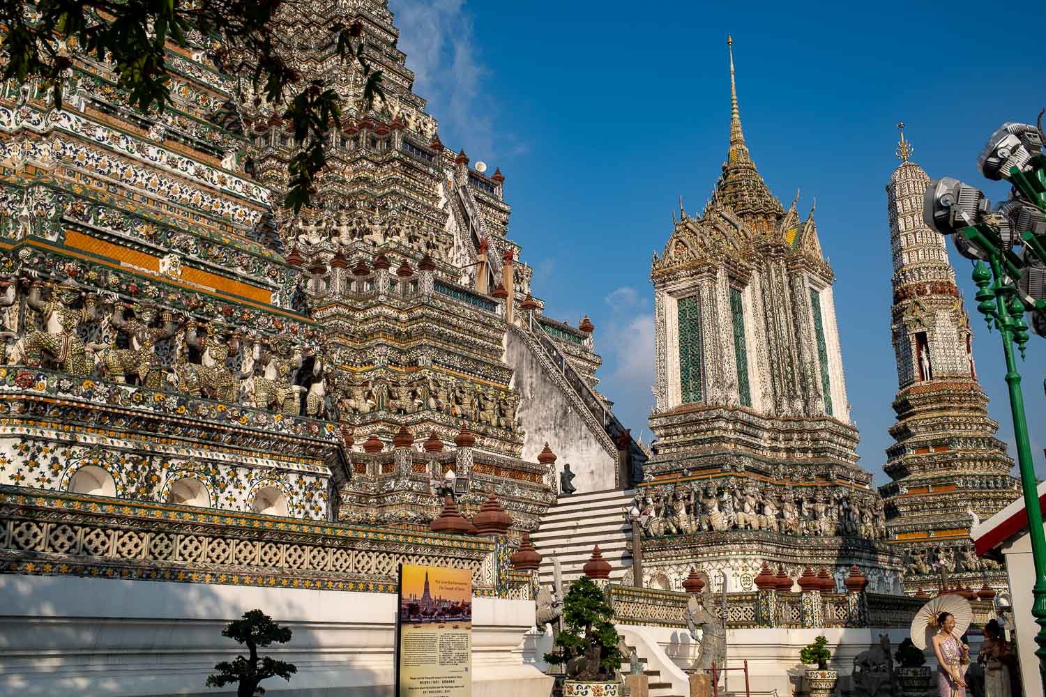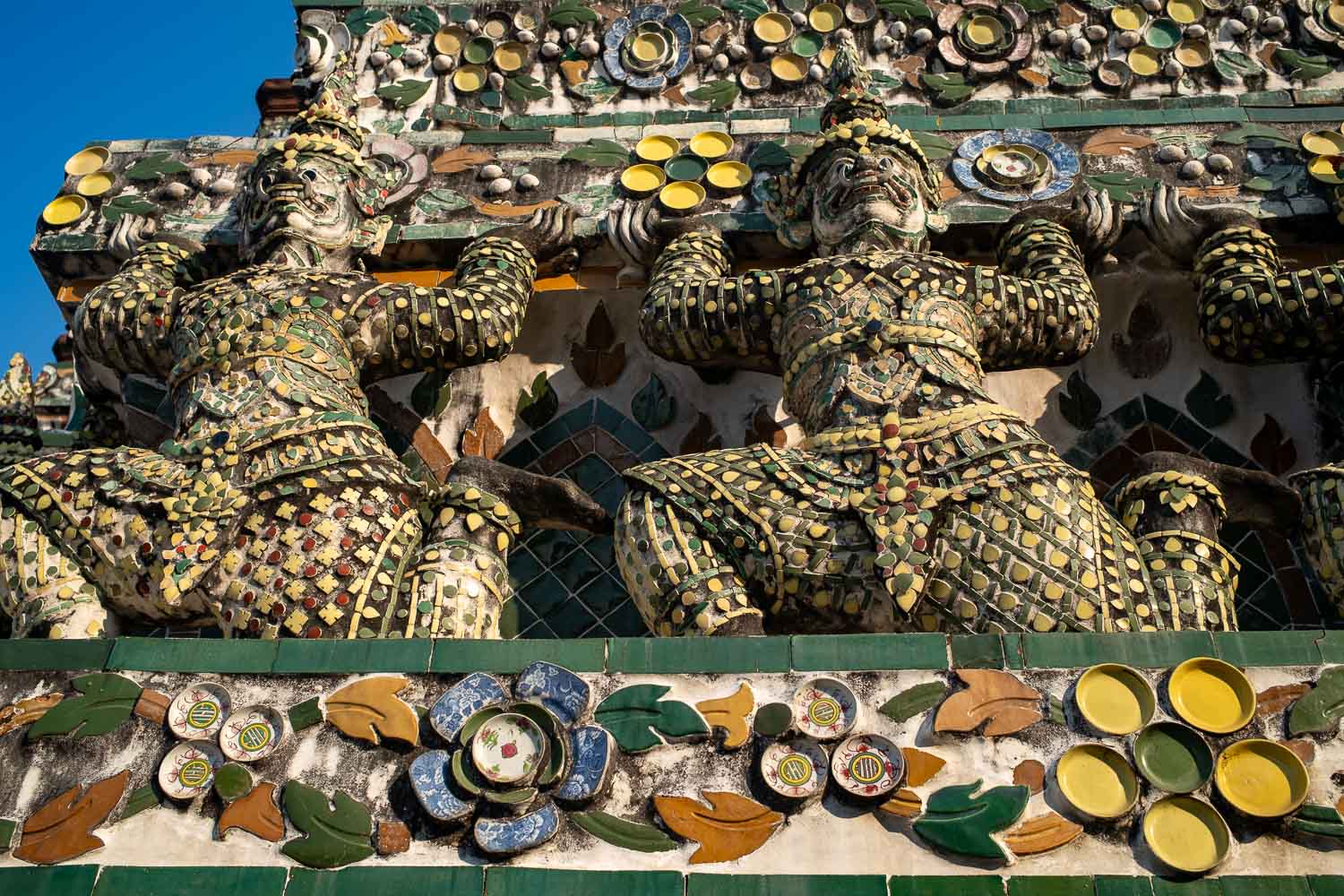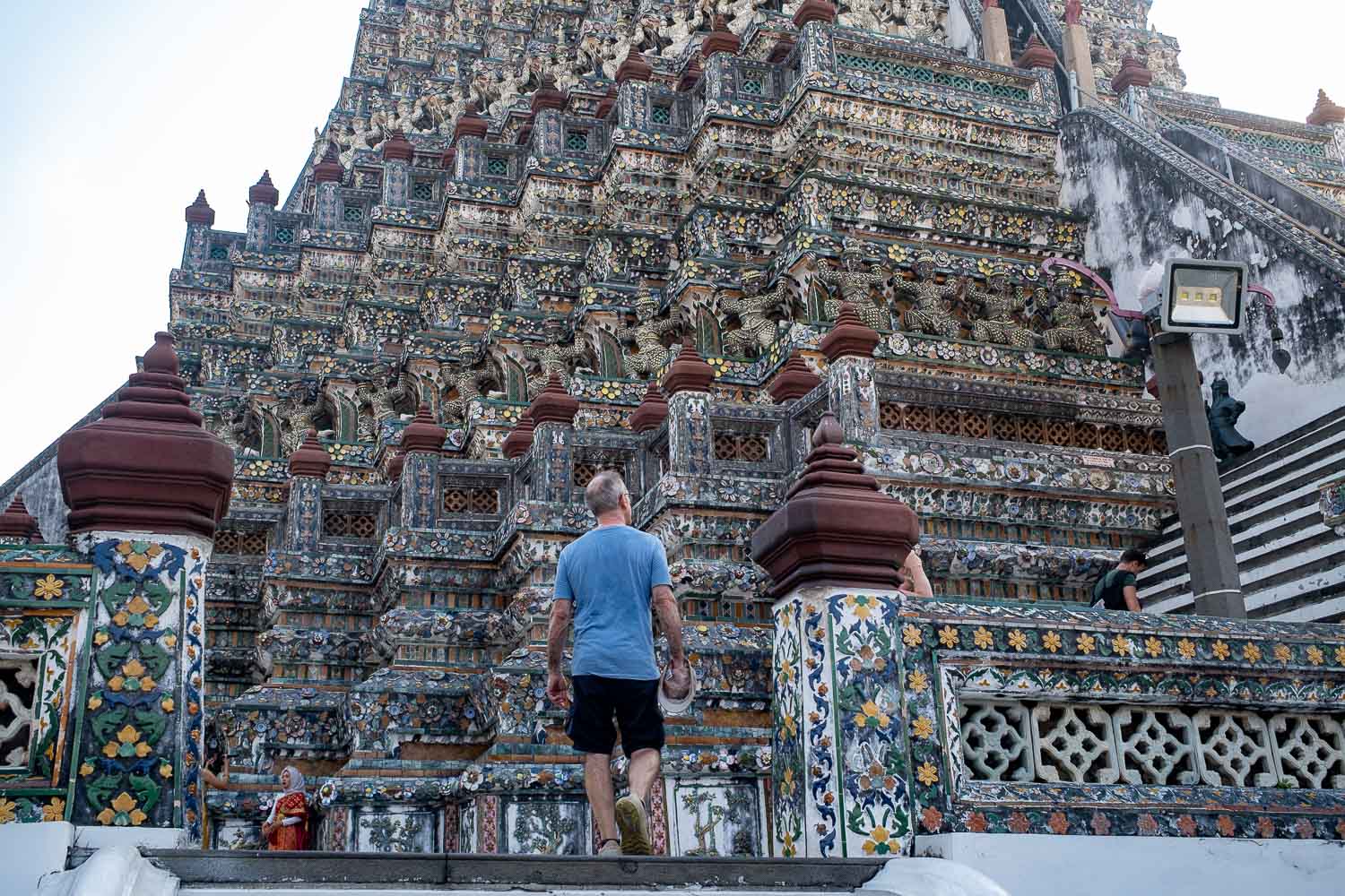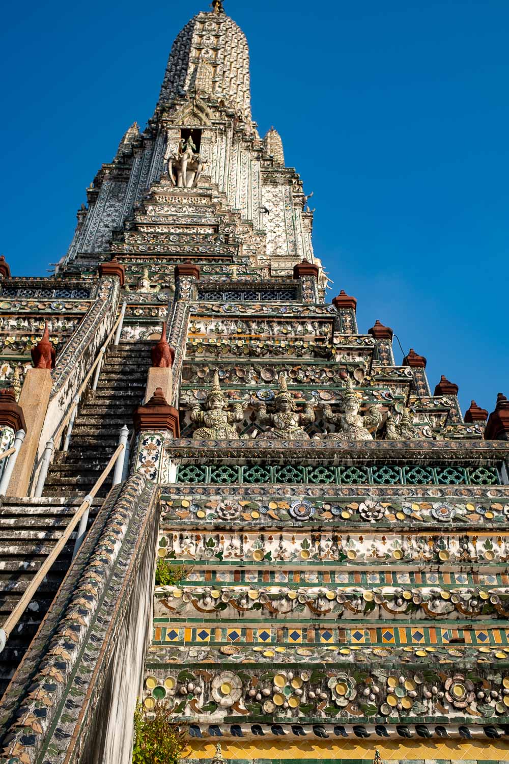 Über sehr steile Stufen steigen wir zur ersten Ebene und bewundern die Mosaike aus buntem chinesischen Porzellan und Muscheln. Insgesamt wurden etwa eine Million Teile zu Blumenmustern arrangiert. Der zentrale Prang soll den heiligen Berg Meru darstellen, der sich aus dem Weltmeer erhebt.